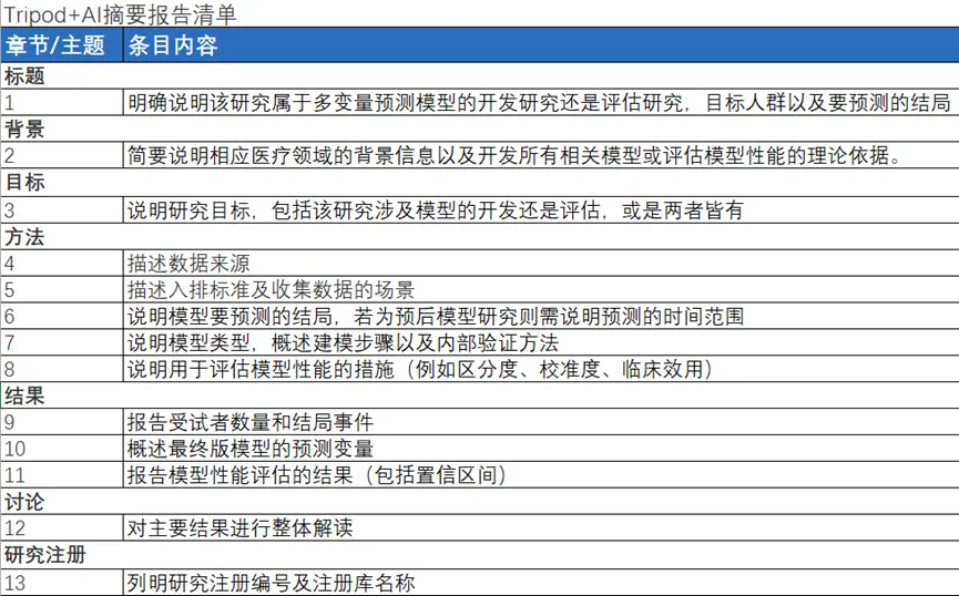 The BMJ于2024年发布了新版的TRIPOD+AI声明。该声明在2015年TRIPOD(Transparent Reporting of a multivariable prediction model for Individual Prognosis Or Diagnosis,个体预后或诊断多变量预测模型的透明报告)声明的基础上新增了有关AI技术细节、代码共享等方面的条目内容,以适配近年AI技术的快速发展,完善基于机器学习方法的预测模型的报告规范并提高报告透明度和完整性。