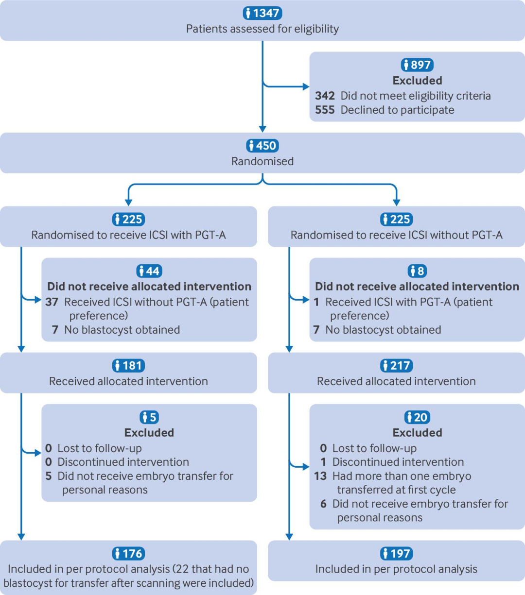 The BMJ 近期发表的一项中国多中心随机对照试验(RCT)揭示:对于因严重男性因素不孕而接受卵胞质内单精子注射(ICSI)助孕的夫妇,联合植入前非整倍体检测(PGT-A)技术虽然能降低妊娠丢失率,但并不能提高活产率。
