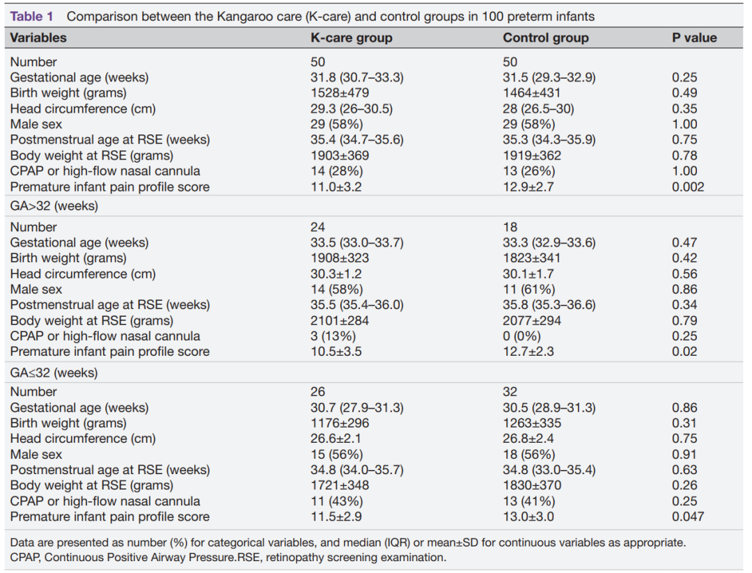 亚组分析将胎龄分为>32周(n=42)与≤32周(n=58)两组,结果表明袋鼠抱对胎龄>32周组能显著减轻ROP筛查时的疼痛感(PIPP mean 10.5 vs. 12.7,p=0.02), 降低ROP筛查后1小时的应激反应(皮质醇水平4.9 vs 7.0 ng/mL, p<0.001)及减少ROP筛查后6-8小时的炎症反应(IL-6 32.1 vs 35.9 pg/ml, p=0.01; TNF-α 53.1 vs 60.6 pg/ml, p=0.009; IL-1β 50.4 vs 56.7, p=0.003);而对于胎龄≤32周组,袋鼠抱能减轻ROP筛查时的疼痛感(PIPP 11.5 vs. 13.0, p=0.047),但对ROP筛查后的应激及炎症反应均无显著影响(p均>0.05)。