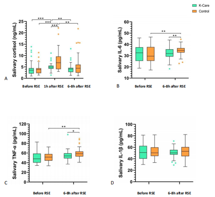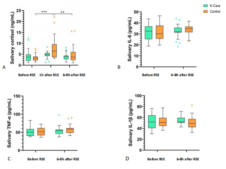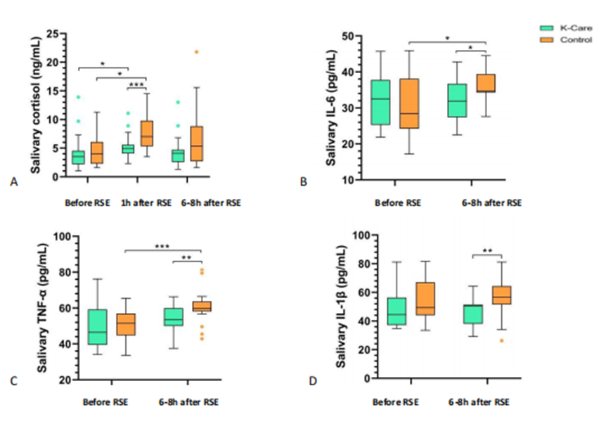 研究结果表明:反向式袋鼠抱能减轻ROP筛查引起的疼痛(PIPP mean 11.0 vs. 12.9,p=0.002),降低ROP筛查后应激反应(皮质醇水平4.9 vs 6.9 ng/ml, p=0.001),并减少ROP筛查后炎症反应(IL-6 31.9 vs 34.7 pg/ml, p=0.01; TNF-α 53.9 vs 58.6 pg/ml, p=0.02)。