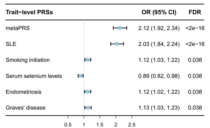 图1 与系统性红斑狼疮发病风险显著相关的性状PRS