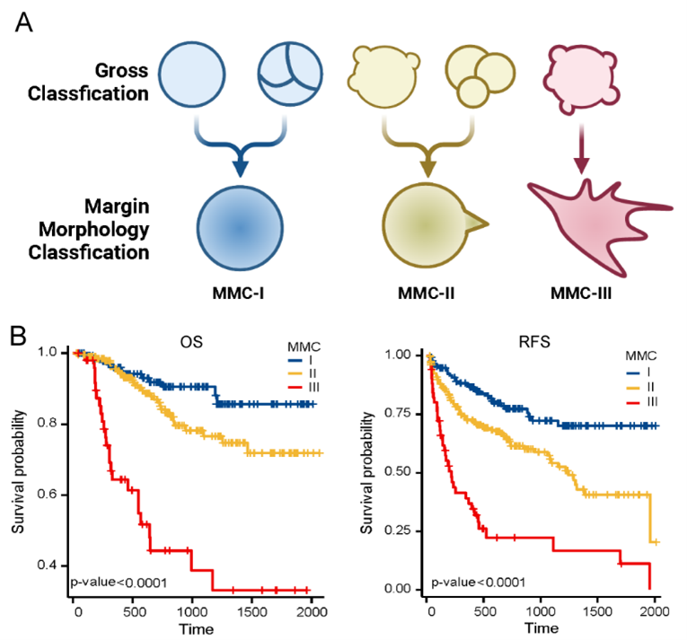 原文献信息: From clinical variables to multiomics analysis: a margin morphology-based gross classification system for hepatocellular carcinoma stratification Fan Z, Jin M, Zhang L, et al. Gut Published Online First: 07 Aug 2023 doi: 10.1136/ gutjnl-2023-330461 肝细胞癌(以下简称肝癌)是肝胆系统最常见的恶性肿瘤,也是肿瘤相关死亡的主要癌症类型之一。近年来,随着治疗理念和技术的革新,虽然肝癌患者预后逐步改善,但是肝癌复发率高仍然是亟待解决的难题。尽管目前存在诸多肝癌分期标准,然而这些标准对于单发肝癌患者分层管理的指导价值和预后判断价值仍极其有限。基于各种类型组学数据的分子分型虽然具有一定临床应用潜力,但是由于花费高以及数据分析难度大等因素,使之难以在临床推广。定义临床适用程度高的分型标准对指导肝癌临床诊疗决策的制定具有重要的临床意义。 大体分型是否有助于判断肝癌患者预后? 图注:不同大体分型肝癌肿瘤组织和癌旁组织差异基因的简化富集分析 大体分型是否可被用于预测治疗反应性? 图注:可切除的肝癌大体分型的临床判断顺序及相应推荐治疗策略 提出可行性更佳的大体病理边缘形态分型(MMC分型) 在实际分型过程中,研究团队发现具有类圆形边缘形态的III型和边缘有局部突出的III型肝癌具有不同的基因表达特征和预后,因此分别将其定义为IIIA型和IIIB型。在此基础上提出了新的肝癌大体分型——大体病理边缘形态分型MMC。该分型关注肝癌结节的边缘形态和生长方式。MMC-I型:光滑型。结节边缘光滑圆钝,膨胀性生长。对应原大体分型I型和IIIA型;MMC-II型:局部外突型。结节边缘较规则,局部外突,外突部分占肿瘤周长≤50%,或≤3个方向的外突。对应原大体分型II型和IIIB型;MMC-III型:浸润型。结节边缘不规则,浸润性生长。外突部分占肿瘤周长>50%,或>3个方向的外突。对应原大体分型IV型。生存分析证实MMC分型能够有效判断肝癌手术患者预后。 图注:A: 大体病理形态分型与大体病理边缘形态分型(MMC)对应关系; B: 不同MMC分型的总生存期和无复发生存期。MMC,大体病理边缘形态分型。OS:总生存期;RFS:无复发生存期。 该研究从临床表征、组织病理和分子特征方面证明大体形态分型对于肝癌患者的临床诊疗分层管理具有切实可靠的临床应用价值。提出对于MMC-III型(大体分型IV型)患者术后联合应用TACE治疗,可以显著改善患者预后。在临床诊疗过程中,应优先判断肝癌结节是否属于MMC-III型,对该类患者的随访应更加密切。 作者简介 第一作者樊钟琦为吉林大学第一医院肝胆胰外一科副主任医师,副教授,硕士研究生导师。中国医师协会外科分会肝胆青年专家工作组委员。金美善为吉林大学第一医院病理科副主任,副主任医师。中华医学会消化病学分会消化病理协作组委员、中国抗癌协会肿瘤病理专业委员肝脏病理学组委员。 通讯作者吕国悦,教授,主任医师,博士生导师。现任吉林大学第一医院党委书记、器官移植中心主任、普通外科中心主任。中华医学会器官移植学分会常委,中国医师协会器官移植医师分会常委,外科学分会器官移植围手术期管理专业委员会副主任委员,中华医学会外科学分会青年委员及移植学组委员,海峡两岸医药卫生交流协会器官移植分会常委,国家癌症中心肝癌质控专家委员会委员,吉林省医疗保障协会会长,吉林省器官移植质控中心主任。现任eGastroenterology共同主编,近5年授权专利10项,编写专著3部,承担国家重点研发计划、国家自然科学基金等课题十余项,发表SCI论文百余篇。 关于 Gut Gut 是全球领先的国际期刊,发表与消化道、肝脏、胆道系统和胰腺相关的一流临床研究文章。 出版频率:月刊 创刊年:1960 2022年影响因子:24.5 官网:gut.bmj.com