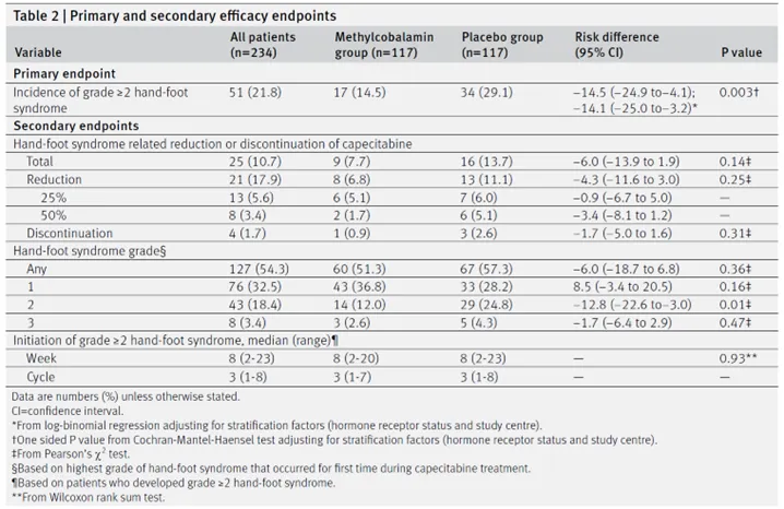 该项III期随机对照临床试验表明,口服甲钴胺与安慰剂相比,显著降低了HER2阴性早期乳腺癌患者在卡培他滨辅助强化治疗中2/3级手足综合征的发生率且未出现额外的毒性反应,并减少了卡培他滨剂量调整的需求。