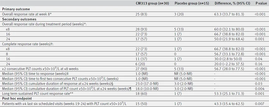 该研究是一项多中心、随机对照试验,纳入了2024年1月至6月于中国5家中心诊断为持续性或慢性ITP的45例成年患者,随机分配至CM313组或安慰剂组。CM313组患者每周静脉注射CM313 16 mg/kg,连续8周;安慰剂组则接受等量赋形剂。