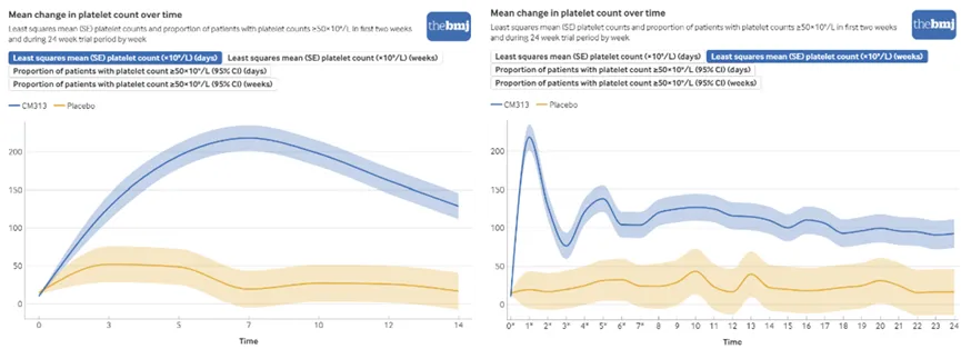 The BMJ 近日在线发表了一项多中心随机对照试验,该研究首次在排除糖皮质激素干预影响的条件下,对CD38单抗CM313治疗成人原发免疫性血小板减少症(ITP)的临床结局进行了系统评估。结果显示,与同样接受预防性糖皮质激素治疗的安慰剂组相比,CM313组血小板计数升高更迅速,中位响应时间仅为1周;至第8周,总体有效率显著优于安慰剂组(83% vs 20%,p < 0.001),并在第24周仍维持持久的疗效反应(57% vs 7%,p = 0.001),进一步推动了CD38单抗在ITP中的临床转化。